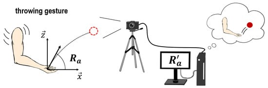 The objective of this paper is to determine how to estimate the motional intentions when underarm throwing. As our solution approach, we aim to estimate the launch angle from the swing of an arm during underarm throwing. As illustrated in Figure 1, the launch angle when a swing is conducted is defined as . Moreover, the estimated launch angle after recording by a measurement device such as a camera is represented by . Depending on the definitions, the relationship between and is described as