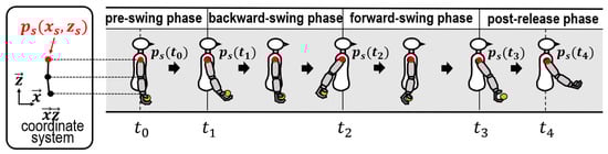 To analyze the underarm throwing motion efficiently, we first described the throwing motion before conducting preliminary experiments. As shown in Figure 2, a series of underarm throwing motions was divided into four phases according to the state of the swinging arm and the condition of ball holding. First, the period from holding the ball to before swinging the arm backward was called the pre-swing phase. Second, the period in which the arm is swung backward was called the backward-swing phase. Third, the period when the arm swings forward before releasing the ball was defined as the forward-swing phase. Fourth, the period after releasing the ball was called the post-release phase. The times required for each phase are represented by , , , and , respectively.