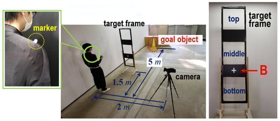 Figure 3 shows the equipment used in the experiments and its settings. To make a distinction of , the target frame was turned upright and positioned in front of each subject. Three target plates (the top, middle, and bottom) in the target frame were installed from the top downward. To capture in line with the changes in , clothes that fit the individual subjects were used. An in-house marker was attached to the shoulder of the subject (left side of Figure 3). To curtail any influence on data acquisition due to marker slippage, the marker location was checked and the clothes were adjusted after pitching. The FDR-AX700 digital 4K video camera recorder (SONY Corporation, Tokyo, Japan) with 1080p and 120 fps was placed beside the subject to capture the movement of the marker. We intended to suppress the disparity in the throwing speed by explaining the throwing method so that the ball could fall near the goal object.
