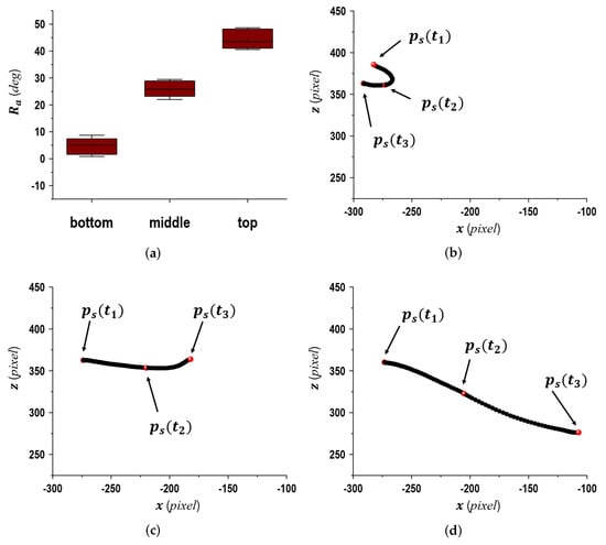 Figure 4 displays at the time when 10 balls were thrown by one subject in each plate (the top, middle, and bottom), as well as for one of the 10 balls thrown. From the results in Figure 4a, we validated that presented a low disparity. However, it changed slightly depending on the plates. Additionally, the data in Figure 4b–d demonstrate different movements for the two phases of and following the changes in .