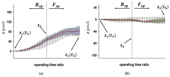 Shoulder movements in and in time ratio for seventeen subjects; the values of x and z in were used as the reference. (a) direction, (b) direction.