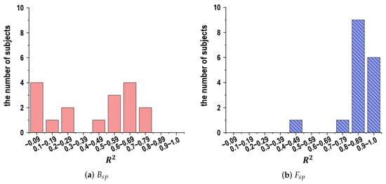 Figure 8a,b shows the analytical results for the number of subjects corresponding to the determination coefficient of in Equations (6) and (7) according to and , respectively. Here, the vertical directions indicate the number of subjects in relation to the determination coefficients. In Figure 8a, although some subjects present a highly precise correlation with , the results exhibit obvious disparity depending on the subject. On the other hand, in Figure 8b the variables in present a highly precise correlation with for many subjects.