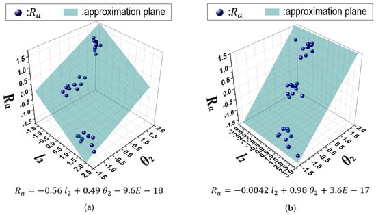 In this subsection, the impact of these variables on according to the time ratio in each phase is divided and analyzed. A well-known regression equation is employed when is the objective variable for the analysis method. Additionally, in Equation (2) and in Equation (3) are used as the explanatory variables of . In , the explanatory variables are defined as and in Equations (4) and (5), respectively. The determination coefficient of is employed to indicate how well the regression equation and actual data fit for the evaluation method. As the analysis deals with quantitative data, the actual is used when throwing the ball toward the three plates. The regression equation of is as follows: