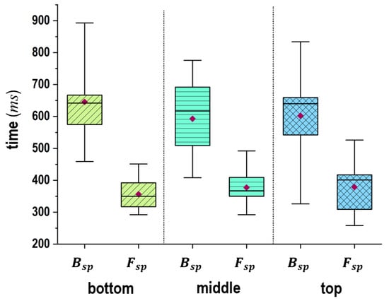 Finally, Figure 10 confirms that the time required for is shorter than for and that the results for have a slighter variance depending on the subjects. Specifically, the subjects requiring 500 to 700 ms for and 300 to 400 ms for had a majority. Moreover, and had a slight effect on the changes in the target plates. Based on these results, it could be concluded that requires less time and has less variation among subjects compared to .