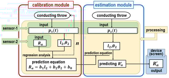 As an enhanced estimation scheme, a calibration and estimation model for underarm throwing motions is proposed. The computation flow in this model is shown in Figure 11. The model comprises calibration and estimation modules. First, the prediction equation for each subject is updated as the calibration module is performed. Then, is estimated employing the updated prediction equation in the estimation module.