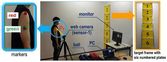 Next, the calibration module in the proposed model was used to update the prediction equation online while conducting throws. Red and green markers were used to clearly extract with respect to from the motion data captured by sensor-1. As shown in Figure 12, these markers were attached to the shoulder and upper arm of each subject, respectively. Similar to the preliminary experiments in Section 3, was read with the red marker. On the other hand, the green marker was used to differentiate the beginning time of from the overall swing motion. After the time of was determined, and were computed and applied to the online prediction equation (see the calibration module in Figure 11). In practice, the extraction of these data was implemented using a Python-oriented real-time object tracking technique through a web camera. Finally, boccia balls were used for the throw.