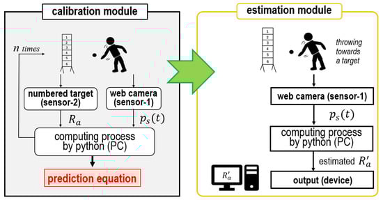 To begin, the calibration module updates the slope of the correlation varying with the subjects. In detail, during ball throwing, is obtained using sensor-1. Then, and are sought from the data. Meanwhile, is input from sensor-2. By repeating the process n times, the regression analysis is performed using these variables and the prediction equation for individual subjects is derived accordingly. This equation is the same as the regression equation (see Equation (7)), and uses the correlation confirmed in .