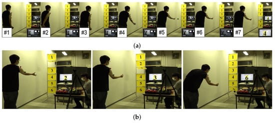 Experimental scenes used to investigate estimation accuracy. (a) a series of underarm-throwing motions toward the four numbered plate, (b) underarm-throwing motion toward the two, three, and six numbered plates.