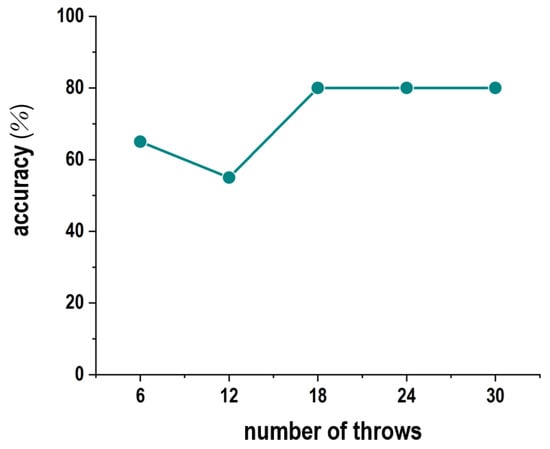 Figure 15 presents the experimental results for the estimation accuracy. Here, we prepared five types of experimental settings by changing the numbers of throws in the calibration module stage. In particular, these results indicate the estimation accuracy when using the prediction equation calculated by throwing five balls toward each number plate in advance. Regarding the estimation accuracy when three balls were thrown in advance at each number plate (total of 18 balls), the accuracy remained at about 80% even when the number of balls increased. This outcome was connected to the fact that the prediction formula converged based on the increase in the number of balls thrown. Consequently, with the throwing of approximately 20 balls in advance, the proposed model could perform the estimation with a stable level of accuracy.