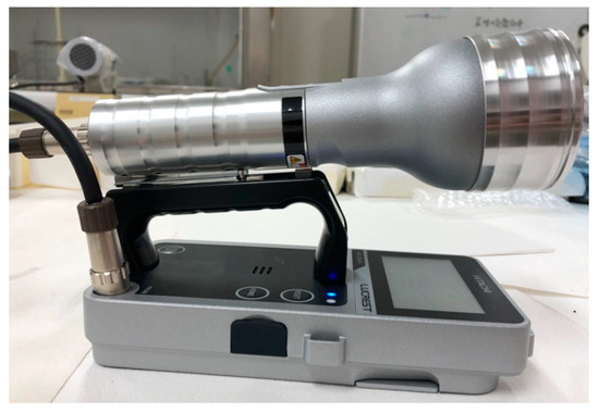 Two types of instruments were used to detect β-rays: a plastic-scintillation survey meter (the LUCREST Rugged Survey Meter TCS-1319H (Figure 3) sold by Nippon Raytec [20]) and a GM survey meter (the TGS-1146 (Figure 4), also sold by Nippon Raytec [21]). Both types of survey meter exhibit relative reference errors within ±25% in catalog data. We used two (Nos. 1 and 2) of each type of instrument, thus four survey meters were used in total.