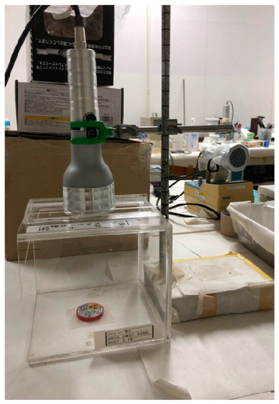 Counts of the beta radiation of sealed Sr-90 and Cl-36 sources were measured in scaler mode for 1 min (i.e., counts per minute) 10 times using the two types of instruments described in Section 2.1; averages were then obtained as indices of the measured values. We performed the experiment five times for each source. When comparing the values obtained for the sources, the background radiation (BG) was subtracted. The radioactivity values of the Sr-90 and Cl-36 sources were 73.5 kBq and 850 Bq, respectively. The distances from the bottom of the source to the surface of the detector instrument were 1.45 cm, 4.45 cm, and 16 cm. A measuring table (PS-202E) from Nippon Raytec was used for the experiments at 1.45 cm and 4.45 cm. For the experiments at 16 cm, a fixture was used instead of the measuring table to ensure geometrically identical conditions. Figure 5, Figure 6 and Figure 7 show the arrangements used for the measurements.