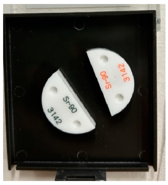The Sr-90 source shown in Figure 8 was used when employing the two-source method for resolving-time measurements; it consists of two half-moon-shaped sealed sources that can be placed together when combined measurements are required. One source bears source information in orange characters and the other has such information in green characters. Let n12 be the count of the two sources measured coincidently, n1 the count of the orange source, n2 the count of the green source, and nb the background. Then, the resolving time τ can be expressed by the following equation [27]:
