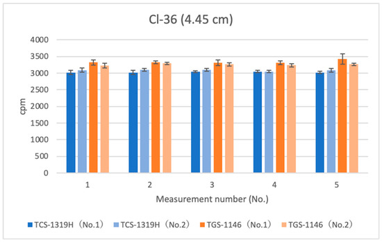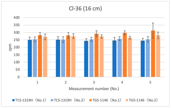 Figure 9, Figure 10 and Figure 11 show the results for Cl-36 at each distance. Error bars in the graphs indicate standard deviations. For the first plastic-scintillation survey meter (No. 1), the averaged measured values (cpm) at distances of 1.45 cm, 4.45 cm, and 16 cm were 10,624.86, 3027.10, and 247.72 cpm, respectively. For the second plastic-scintillation survey meter (No. 2), the values were 10,908.88, 3083.40, and 253.82 cpm, respectively. For the first GM survey meter (No. 1), the measured values were 11,405.16, 3336.96, and 292.50 cpm, respectively. For the second GM survey meter (No. 2), the values were 11,172.38, 3256.32, and 272.58 cpm, respectively. Compared with the GM survey meters, the differences in the sensitivities of the plastic-scintillation survey meters were −4.62%, −7.32%, and −11.30% at 1.45 cm, 4.45 cm, and 16 cm, respectively (Table 2). According to the catalog data, both types of instruments exhibit relative reference errors within ±25%. In other words, all measurement disparities were within the relative ranges of reference error. At all distances, the GM survey meters yielded slightly higher values. However, the degree of error was not an issue. During measurements of Cl-36, the performances of each survey meter were approximately equivalent.