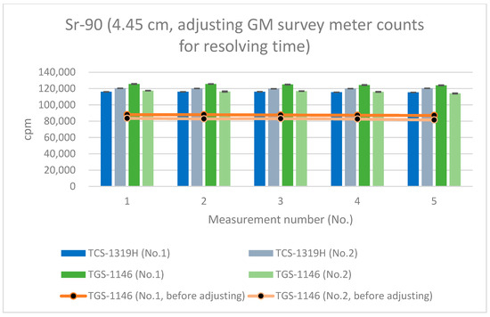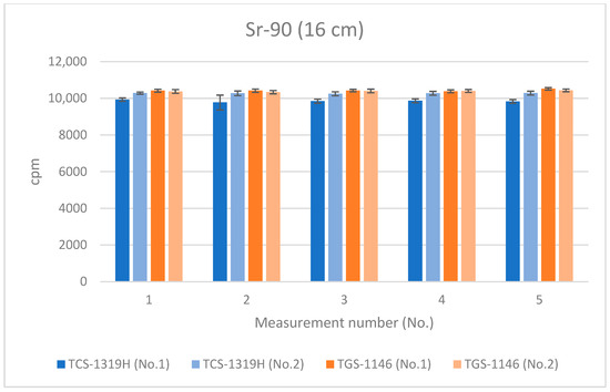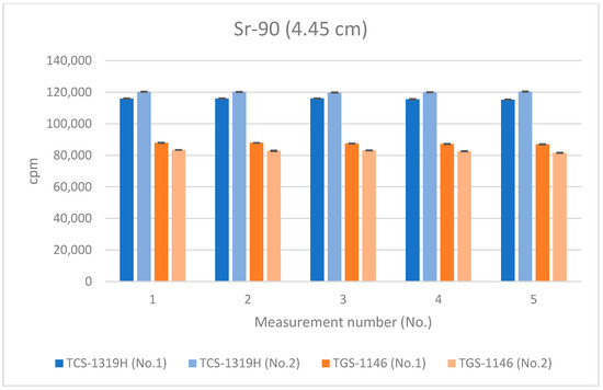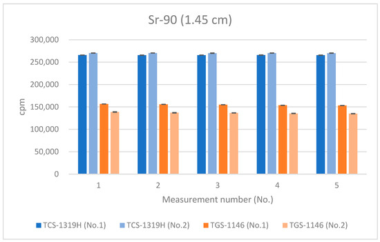 Figure 12, Figure 13 and Figure 14 show the results for Sr-90 at each distance. All error bars in the graphs indicate standard deviations (N = 10). For the first plastic-scintillation survey meter (No. 1), the averaged measured values at distances of 1.45 cm, 4.45 cm, and 16 cm were 265,731.34, 115,793.44, and 9849.54 cpm, respectively. For the second plastic-scintillation survey meter (No. 2), the values were 270,300.12, 120,131.38, and 10,275.68 cpm, respectively. For the first GM survey meter (No. 1), the measured values were 154,847.78, 87,535.98, and 10,434.40 cpm, respectively. For the second GM survey meter (No. 2), the values were 136,554.34, 82,743.12, and 10,391.46 cpm, respectively. The disparities in the counting rates of the plastic-scintillation survey meters compared to the GM survey meters were 83.95%, 38.55%, and −3.36% at 1.45 cm, 4.45 cm, and 16 cm, respectively (Table 3). The values measured by the two types of meter were closest when the distance was 16 cm. However, at shorter distances, the plastic-scintillation survey meter values were much higher than those of the GM survey meters, with a difference exceeding the relative reference errors. The cause of this result will be investigated and clarified later in the text.