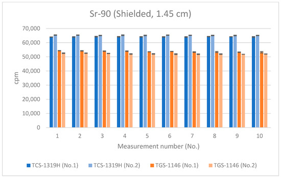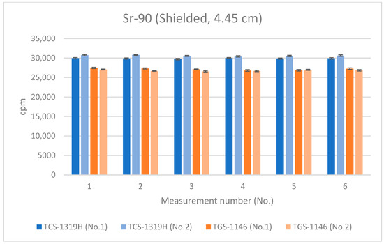 Next, measurements at the distances detailed in Section 3.1 were repeated with the absorber placed on top of the Sr-90 source; the results are shown in Figure 15, Figure 16 and Figure 17. All error bars in the graphs indicate standard deviations (N = 10). For the first plastic-scintillation survey meter (No. 1), the averaged measured values for Sr-90 at distances of 1.45 cm, 4.45 cm, and 16 cm were 64,107.60, 29,897.48, and 2480.95 cpm, respectively. For the second plastic-scintillation survey meter (No. 2), the values were 65,190.40, 30,631.42, and 2581.94 cpm, respectively. For the first GM survey meter (No. 1), the measured values were 53,730.13, 27,145.73, and 2753.90 cpm, respectively. For the second GM survey meter (No. 2), the values were 52,113.02, 26,804.48, and 2705.19 cpm, respectively (Table 4). The disparities in the counting rates of the plastic-scintillation survey meters compared to the GM survey meters were 22.16%, 12.19%, and −7.26% at 1.45 cm, 4.45 cm, and 16 cm, respectively. As in Section 3.1 above, when the detection distance was short, the values measured by the plastic-scintillation survey meters were larger than those measured by the GM survey meters. However, the disparities were much lower than when the absorber was not used.