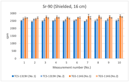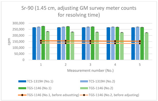 All error bars in the graphs indicate standard deviations (N = 10). From these results (the graphs of Figure 20, Figure 21 and Figure 22), it can be seen that the counting rates of the plastic-scintillation survey meters and the GM survey meters were comparable after adjusting for the counting losses of the GM survey meters. The disparities in the counting rates of the plastic-scintillation survey meters relative to the GM survey meters became 7.42%, −2.08%, and −8.05% at 1.45 cm, 4.45 cm, and 16 cm, respectively. The results for TGS-1146 (no. 2) remain lower than the others at 1.45 cm. Individual differences between models may have affected this result (they are not sufficiently large to be problematic).
