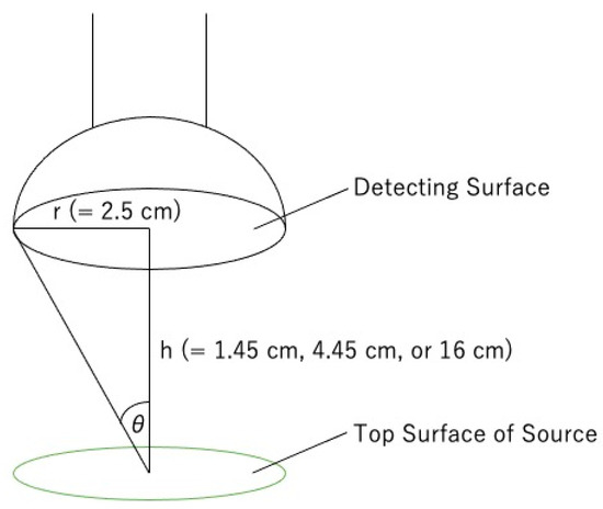 As noted in Section 2.2, the radioactivity A is 850 Bq for the Cl-36 source and 73.5 kBq for the Sr-90 source. The fraction of solid angle covered by the detector λ1 can be expressed by Equations (3) and (4) when the distance between the source and the detector is h (1.45 cm, 4.45 cm, or 16 cm) and the radius of the detector surface is r (2.5 cm for both the plastic-scintillation survey meters and the GM survey meters) as shown in Figure 18.