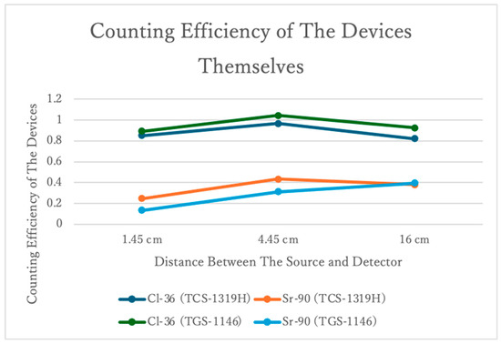 The graph shows that the counting efficiencies of both the plastic-scintillation survey meters and the GM survey meters are smaller during Sr-90 measurements compared to Cl-36 measurements. Both instrument types may not be able to adequately measure the high-energy β-rays from Y-90. The decreases in the counting efficiencies of the GM survey meters were particularly noticeable as the distance between the meter and the source decreased.