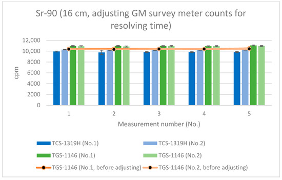 Measurement results for Sr-90 at 16 cm distance (with adjustment of the GM survey meter counts for the resolving time).