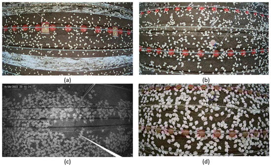 Examples of challenges in chicken counting: occluding and cluttering feeding plates and pipelines, camera distortion (particularly in the image corners), varied chicken sizes (in all images), white paint on the floor (a), smaller sized chickens (b), poor illumination (c), and high chicken density (d).