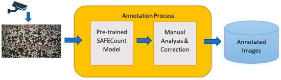 A supervised chicken-counting dataset was created using real-time CCTV footage from a chicken farm and semi-automated annotation was conducted with SAFECount [46]. The focus was on creating diversity by capturing the images’ varying lighting conditions, as well as different chicken sizes, densities, and positions. For annotation, as shown in Figure 2, the unlabeled image was passed into the pre-trained SAFECount model to annotate the chickens automatically. The automatically annotated results were analyzed manually to correct incorrect annotations. Each annotation contained boundary box chicken coordinates (xmin, ymin, xmax, ymax) and was used to calculate the center coordinates (x, y). Center coordinates (x, y) were calculated as follows:
