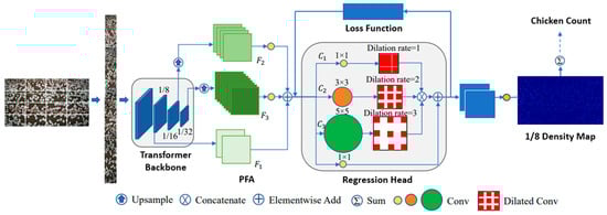 As shown in Figure 3, the architecture consists of four main components: a pyramid vision transformer (PVT), a pyramid feature aggregation (PFA) module, an efficient regression head, and a set of tailored loss functions. The PVT generates multi-scale features from the input image and is composed of four stages, each with a different number of transformer blocks and spatial resolution. The transformer blocks use self-attention and feed-forward networks to process the image patches as tokens. The PVT can handle different levels of chicken density and scale by producing features with different granularities. The PFA module fuses the low- and high-level features from different PVT stages and consists of two sub-modules: a feature-fusion sub-module and a feature-refinement sub-module. The feature-fusion sub-module uses element-wise addition to combine the features from adjacent PVT stages, while the feature-refinement sub-module uses convolutional layers to enhance the fused features. The PFA module improves the feature representation and preserves the spatial information of the chicken scenes. The efficient regression head is used to predict the density maps of the chicken scenes, which can reflect the number and location of the chickens. The regression head uses multi-scale dilated convolution (MDC) to process the features from the PFA module. The MDC can enlarge the receptive field and maintain the spatial resolution without increasing the computational cost. The regression head outputs a density map for each scale level, which is then summarized to obtain the final density map.