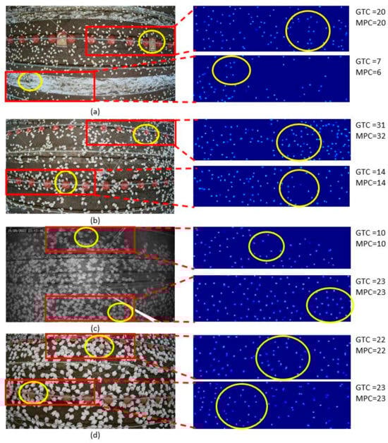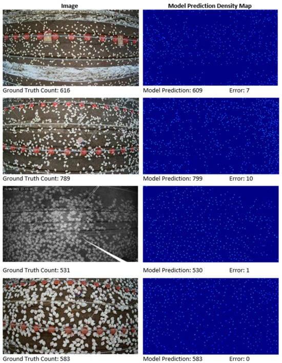 The results of the proposed chicken-counting model, as demonstrated with 27.8 MAE and 40.9 RMSE on the validation set and 22.0 MAE and 32.3 RMSE on the test set, underscore the precision of our approach (see Section 4.1 for detailed results). The model exhibited efficacy even under challenging conditions such as varying illumination, cluttered backgrounds, partial occlusions, continuous chicken growth, and camera distortion. Qualitative results, depicted in Figure 5, visually corroborate these findings.