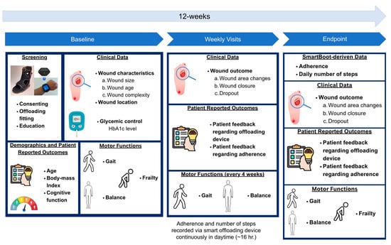 This manuscript presents preliminary findings from an ongoing parallel randomized controlled trial (ClinicalTrials.gov identifier: NCT04460573) conducted at the Keck School of Medicine, University of Southern California. The overarching goal of the parent study was to investigate how interactive offloading devices, called smart offloading, can improve adherence, and enhance the outcomes of wound healing in individuals with diabetes. The validity and acceptability of the smart boot for the real-time estimation of adherence to offloading and step count have been presented in prior studies [,]. However, this study focused on designing and evaluating a holistic remote patient monitoring system. This system aims to simplify the visualization of the key risk factors associated with unfavorable outcomes of wound healing, aiding clinicians in personalizing wound care. It includes tailored patient education that may optimize the outcomes of healing while guiding patients in maintaining healthy mobility and mitigating secondary consequences, such as frailty, poor balance, and gait. Participants meeting specific inclusion criteria, such as having diabetes and a diabetic foot wound, were enrolled in the study, whereas those with high A1c levels (>12), a lack of mobility, multiple wounds, or poor adherence to offloading devices were excluded. The study protocol was approved by the institutional review board of the University of Southern California. Figure 1 illustrates the overall study design.