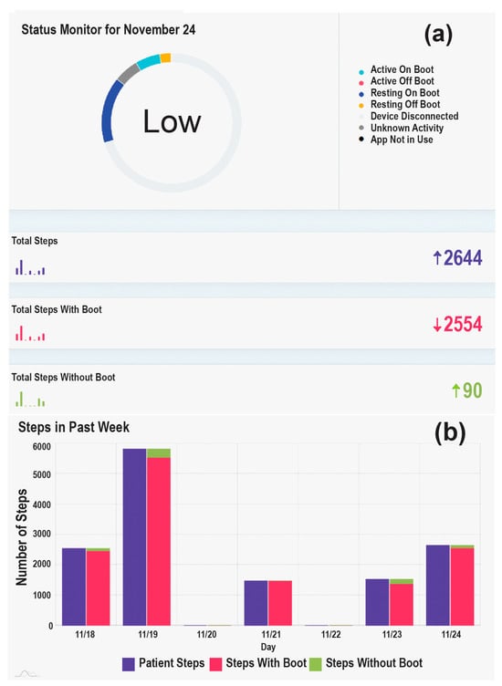 To monitor adherence to usage of the offloading device and collect step count data, a smart offloading boot system was used. This system consisted of a removable offloading boot (Foot Defender, Defender Ops., South Miami, FL, USA), a Sensoria Core microelectronics device, and an Android 4G/LTE smartwatch custom app developed by Sensoria Health Inc. (Sensoria Core, Sensoria Health Inc., Redmond, WA, USA) [,]. The Sensoria Core utilized an IMU with 6 degrees of freedom to capture the boot’s movements and a Bluetooth low-energy (BLE) module to communicate with the smartwatch. The Sensoria Core transmits the collected data to the smartwatch, which processes and displays real-time information, including the boot’s condition (worn or not worn), activity status (active or resting), step count, and notifications. These data are also sent to the Sensoria cloud system. This enables clinical providers to evaluate the patients’ adherence to offloading and visualize step counts with and without offloading, as shown in Figure 2. Adherence to the offloading boot was calculated using embedded algorithms on the cloud and presented as graphics to the clinical team. Additionally, the website allowed the recording of notifications and alerted the clinician team if the participants removed their boots.