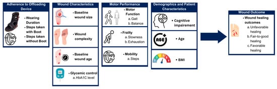Diabetic foot ulcers (DFUs) pose a significant challenge in the management of diabetes and represent a serious complication that requires careful attention. Every 1.2 s, someone develops a DFU and every 20 s, someone with DFU undergoes an amputation []. One of the key approaches to treatment for DFUs involves the use of offloading devices, which aim to distribute force and reduce pressure on the wound, thereby facilitating the healing process []. While adhering to the appropriate use of these devices is recognized as a crucial strategy to promote the healing of DFUs, some individuals who adhere to offloading device protocols still struggle to achieve healing. This suggests the existence of other contributing factors that need to be considered, including the characteristics of the wound and diabetes, motor function, and patient-reported outcomes [,,]. Although current advancements in DFU management have begun implementing smart technology and wearables, studies have mostly focused on one parameter such as pressure or temperature and informing the patients about the changes in these parameters [,,,,,,,].