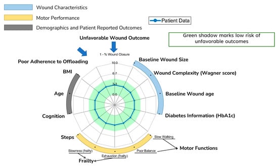 The holistic visualization system consists of a radar plot that displays digital metrics associated with the risk of unfavorable outcomes of the wound. Areas shaded in green indicate a low risk of unfavorable outcomes, offering a comprehensive visual representation of the patient’s data for medical assessment.
