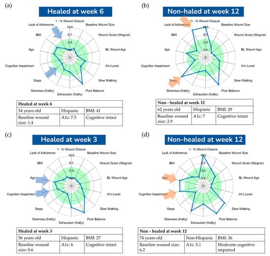 For continuous variables, if the scale was linear and in a limited range (e.g., the MoCA score), then we mapped them to 0 to 10; if needed, we reversed it to indicate that higher values signified higher risk. If the continuous values were not confined within a range and/or the increase in risk did not necessarily have a linear association with these metrics (e.g., age, BMI, cadence, balance, and the wound’s characteristics), then we categorized the variables a low risk (value of 0), medium risk (value of 5), and high risk (value of 10) on the basis of thresholds represented in the literature. For example, glycemic control, quantified by hemoglobin A1c (HbA1c) levels, are known to correlate with the outcomes of healing, and higher values are associated with poor wound healing []. Research [] has shown that HbA1c levels above 8% indicate poor glycemic control, warranting the highest risk score of 10. Conversely, levels of 7–8% are regarded as fair glycemic control, with a medium risk score of 5; below 7% was given a low-risk score of 0. Through use of these thresholds, the A1c levels were normalized on a scale from 0 to 10.