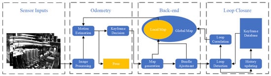 General keyframe-based visual SLAM algorithm pipeline (similar to [,,]). ‘Image Processing’ includes image distortion, feature extraction, etc., and procedures for image matching to find correspondence; ’Keyframe Decision’ considers whether the current map supports odometry to estimate the current state; ’Map generation’ triangulates the pixels to 3D map points; ’History updating’ updates the dataset by inserting new keyframes for potential loop detection.