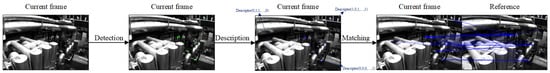 Finding correspondences between the current frame and the reference for the feature-based method (images come from EuRoC [] dataset). Detection detects pixels with distinctiveness and repeatability; description creates the unique descriptor of features for feature matching; matching compares the similarity of those descriptors to match features.