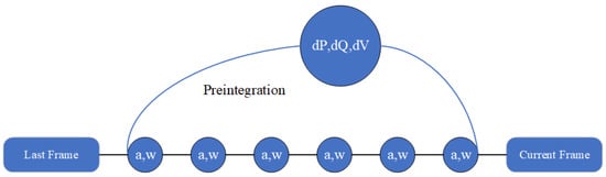 IMU measurements pre-integration: letters a and w, respectively, represent acceleration and angular velocity; dP, dQ, and dV are increments of position, orientation, and velocity between the last frame to the current frame.