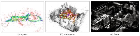 White walls, space, and long tunnels, texture-less environments, severely undermine feature-based visual SLAM algorithm performance. The direct method performs more robustly in those environments and is accurate because of the utilization of all image pixels. It tracks the image by minimizing photometric error at the assumption of intensity invariance, subsequently saving the computational cost of feature extraction. This method can be categorized into three types: dense, semi-dense, and sparse (see Figure 4). The dense method is used in indoor scenes, with depth images provided by an RGB-D camera to construct the dense surface. The semi-dense approach builds the depth map of the vicinity of gradient pixels with the monocular camera and some prior geometry. However, both the dense and the semi-dense methods fail to jointly optimize pose and structure, leading to less accuracy. The sparse method constructs a sparse map of gradient pixels or patches, which can be jointly optimized with poses to achieve more accurate results.