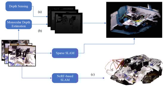 In UAV applications, obstacle avoidance, path planning, and real-time reconstruction, a dense or semi-dense map will be required. However, for robustness, accuracy, and efficiency of localization, visual SLAM algorithms usually retain a sparse map for joint optimization. To this end, another denser map is constructed by obtaining depth images and associated odometry. Depth images are projected using a camera model to produce a dense point cloud, which is aligned by the odometry of the SLAM algorithm [,]. This approach usually requires depth sensors, such as Realsense D435i, Realsense D455, and Kinect v2, to provide depth images. This approach is limited by the performance of depth sensors like RGB-D cameras, which will be disrupted by sunlight and will fail to measure the depth of outdoor long-range scenes. Therefore, gathering the depth from original visual SLAM inputs gains excellent interest, reducing the sensors’ cost and improving the synchronization between depth image and odometry, since the depth sensor probably needs to be better synchronized with SLAM algorithm inputs. With the advancement of GPUs, Jetson developer kits such as Jetson Xavier NX, Jetson TX2, and Jetson Orin integrate GPUs into embedded devices to enable the implementation of learning-based modules. These low-cost devices are suitable for autonomous mobile robots such as UAVs and have been successfully applied in commodity drones such as Skydio. There are some advantages of learning-based enhancement for UAV perception: