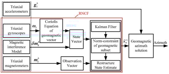 The remainder of the paper is structured as follows: Section 2 shows the principle of the azimuth solution of the gyroscope-aided magnetometer-based MWD system. Section 3 describes the magnetic dynamical system model. A detailed RNCF method with which to obtain the desired geomagnetic vector is shown in Section 4. Section 5 presents experimental results and discussions. Section 6 concludes the results of the study.