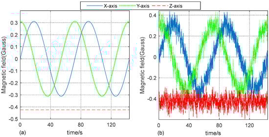 The triaxial magnetic data of the simulation test setup. (a) The theoretical data and (b) the raw triaxial magnetic data in the simulation.