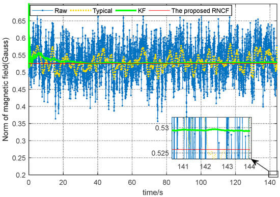 As shown in Figure 7, the norm of the raw triaxial magnetic data shows substantial fluctuations between 0.35 and 0.70 Gauss with an RMSE 0.0475 Gauss. Due to the strong magnetic disturbance, the norm of the typical geomagnetic filter presents some between 0.47 and 0.58 Gauss with an RMSE 0.0215 Gauss. The norm of the KF shows some fluctuations between 0.51 and 0.69 Gauss with an RMSE 0.0082 Gauss, while the proposed RNCF always maintains 0.0057 Gauss (the geomagnetic field strength) due to the normalization of the geomagnetic subset of the state vector.
