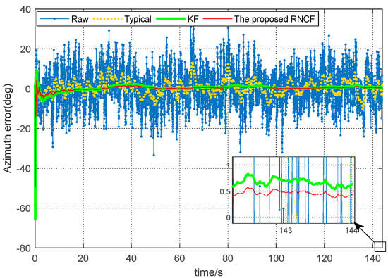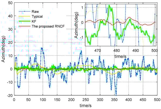 As evident in Figure 9, the azimuth derived from the raw magnetic readings and the typical geomagnetic solution show significant fluctuations. This is because of their poor immunity to the strong magnetic interference, while azimuth derived from the magnetic readings filtered by KF and RNCF are relatively smaller, due to the assistance of the gyroscope triad.