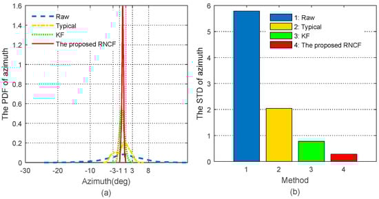 Comparison of the statistical parameters of the azimuths from raw magnetic readings, the typical geomagnetic solution, KF, and the proposed RNCF. (a) The PDF of the azimuth. (b) The STD of the azimuth.