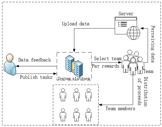 The system model proposed in this section considers a real scenario [14], wherein task requesters post tasks on the platform. The platform selects suitable teams from a large pool of teams to execute the tasks and eventually delivers the data back to the requester. In the collaborative crowdsensing process, how to recruit users to form teams and distribute rewards to incentivize members is an essential consideration. The system model is illustrated in Figure 1.