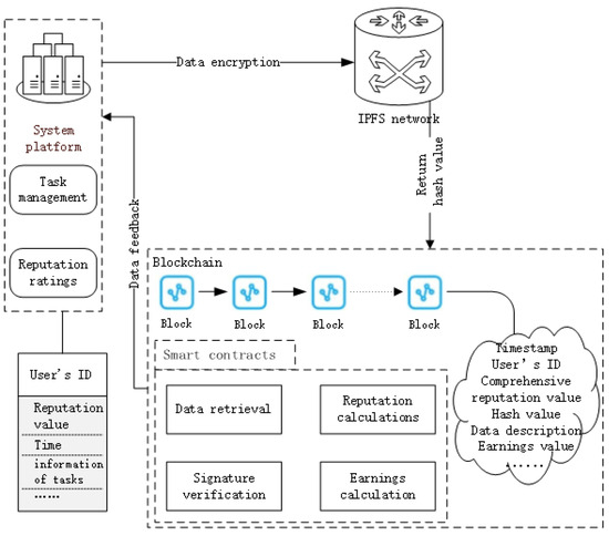 Upon completion of tasks by the team members, the system platform evaluates their reputations based on their task completion status. Then, it encrypts detailed member information, task-related data, and the evaluated reputation values for the current task. These encrypted data are uploaded to the IPFS (InterPlanetary File System) distributed storage system. Moreover, key information about these data, such as data description, data type, and encrypted hash value, is published to the blockchain [15], ensuring the security and reliability of member reputation data. Smart contracts within the blockchain retrieve historical data based on uploaded member IDs. They automatically calculate the comprehensive reputation value using preset rules and algorithms. Subsequently, the smart contracts compute the earnings for each member and write the executed contract result into the block. The earnings data are then sent back to the system platform. As shown in Figure 2, the platform will distribute the income according to the income value of each member, so as to motivate team members to actively participate in the task and maintain a good reputation.