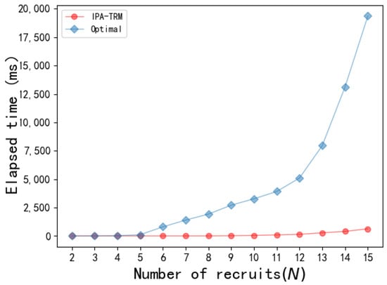 The algorithm’s runtime is a critical performance metric for measuring an algorithm’s efficiency. This paper compares the time costs between the IPA-TRM algorithm and the global search algorithm Optimal. Initially, with a task budget set at 500 and a total platform user count of 30, the recruited user count was increased from 2 to 15. The experimental results, as shown in Figure 7, show that when N increases from 2 to 5, there is little difference in the time cost between the two algorithms. However, as N increases from 5 to 12, the time cost gap between the Optimal and IPA-TRM algorithms gradually widens. When , Optimal’s time cost experiences a sharp increase, while the IPA-TRM maintains only a minimal increase. Therefore, the IPA-TRM outperforms Optimal in algorithm performance.