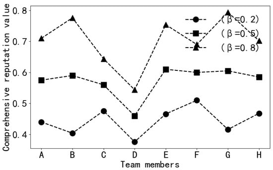 In this experiment, the parameter is set to values of 0.2, 0.5, and 0.8. As shown in Figure 8, each curve represents the impact of different values on the members’ comprehensive reputation: