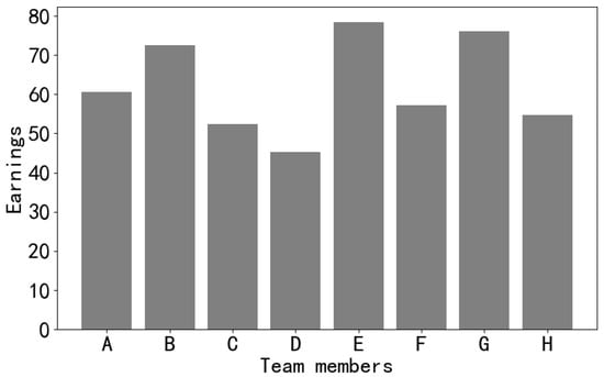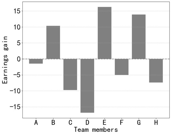 The gain in earnings refers to the difference between each member’s earnings and the average earnings, calculated as earnings minus the mean earnings. By computing the gain in earnings, a clearer view emerges regarding the extent to which each member’s earnings deviate from the team’s average earnings. As shown in Figure 10, members B, E, and G exhibit positive gains in earnings, indicating that they have earned higher than the average level. Members A and F show gains in earnings close to the average level, suggesting their contributions align closely with the team average, leading to a relatively equitable distribution of earnings. On the contrary, members C, D, and H display negative gains in earnings, implying that they have earned less than the average level. This might suggest lower contributions from them or, to some extent, a negative impact on the team’s performance.