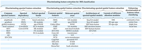 In summary, HSIs are provided with intricate spectral and spatial information, but the redundant bands and irrelevant areas may shrink the inter-class distance and expand the intra-class distance, which hampers algorithms to construct the discriminating feature distributions for classification to some degree. Therefore, researchers have paid increasing attention to these problems from traditional hand-crafted features to deep architectures and attention modules and proposed various effective methods and tricks to improve feature representation. In this article, techniques to discriminate features for HSI classification are summarized from the perspectives of feature extraction and feature optimization comprehensively. For feature extraction, including spectral features, spatial features, and spectral–spatial features, various techniques are summarized from the aspects of the characteristics of the data and the architectures of the models. For feature optimization, techniques to regulate the feature distribution in the classification space are illustrated. Moreover, the superiorities and limitations of the existing methods and possible future challenges to promote the discrimination of features for HSI classification are also pointed out.