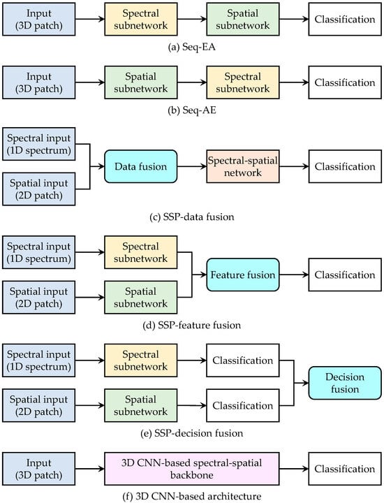Spectral–spatial models are designed to obtain comprehensive features from both spectral and spatial dimensions of HSIs. In this section, considering that the features extracted by deep neural networks are often more complex than those of traditional hand-crafted features, spectral–spatial models based on deep learning are referenced. These models can be divided into four classes.