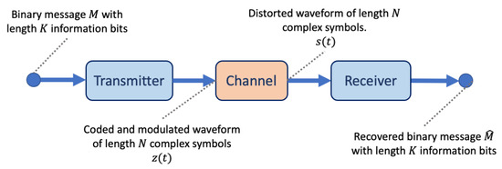 In our work, we assume a single input single output (SISO) wireless communications system. A K bit binary message M is coded with an N bit code and modulated at the transmitter to produce a set of complex transmitter symbols . Experiments are carried out with bits and symbols. The transmitter symbols are transferred over the wireless channel, which we simulate as a transfer function . The channel adds noise and other perturbations such as fading. In this article, training is carried out at a fixed signal to noise ratio (SNR) of 6 dB, and evaluation is performed over the SNR range of 0 dB to 15 dB. The receiver is responsible for detecting the signal, correcting distortions, demodulation, and decoding to produce an estimate of the original message . In our system, we assume perfect synchronisation; therefore, we do not add additional effects such as time delay, phase, or carrier frequency offset. The set of channels that are applied in this article are described in Section 3.5.